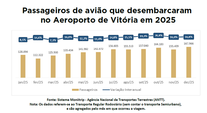 A movimentação intensa também se refletiu no transporte de passageiros. Segundo dados da Agência Nacional de Aviação Civil (Anac), 167.966 pessoas desembarcaram no Aeroporto de Vitória em dezembro, alta de 16,8% em relação ao mesmo mês de 2024. No acumulado de 2025, o total de passageiros chegou a 1.744.147, crescimento de 14,5% frente ao ano anterior, o que representa 221.398 desembarques adicionais.