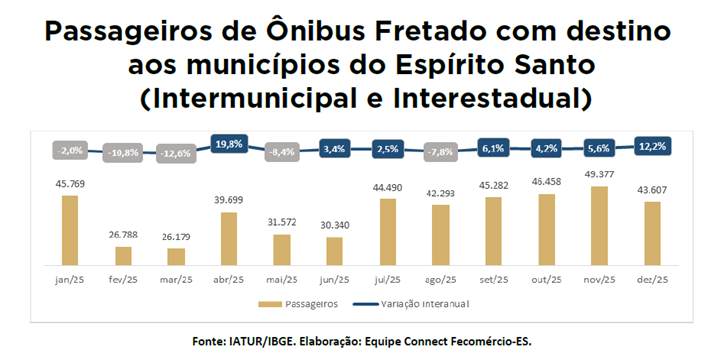 No transporte fretado, modalidade diretamente ligada ao turismo por atender excursões, passeios e eventos, foram registrados 43.607 passageiros em dezembro, avanço de 12,2% na comparação anual. Ao longo de 2025, 471.854 pessoas desembarcaram no estado por meio desse tipo de transporte, alta de 1,3% frente a 2024.