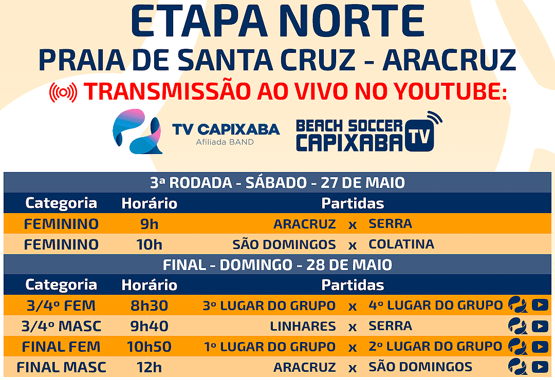 As finais e as decisões de terceiro lugar terão transmissão ao vivo da Fecabes TV e da TV Capixaba, no YouTube. As partidas têm início a partir de 8h da manhã, no domingo, dia 28 de maio.