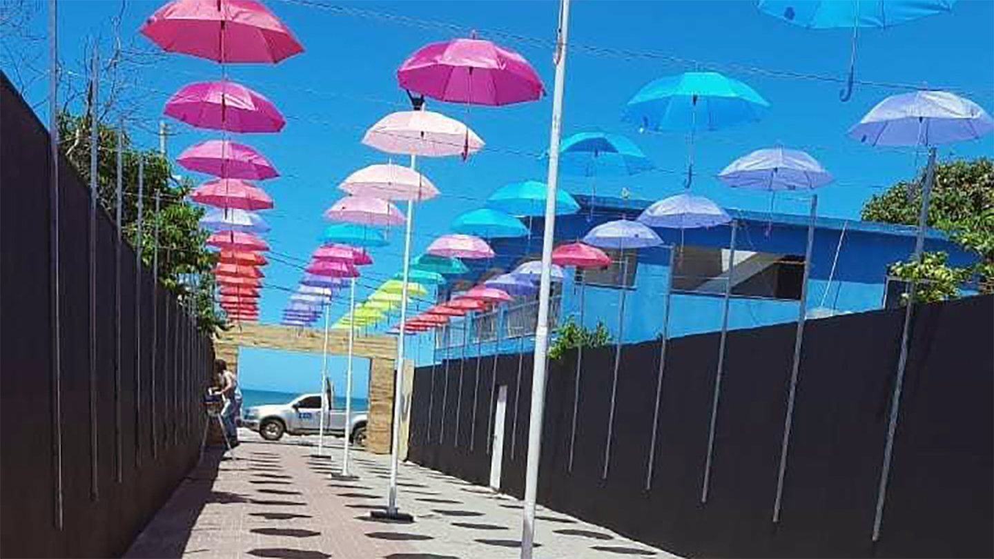 Na instalação do instagramável, a Secretaria Municipal de Turismo (Semtur) utilizou mais de 150 guarda-chuvas, que ficam suspensos no ar ao longo dos 40 metros da passarela na Rua Geraldo Cunha, que liga a praia de Itaoca à Avenida Itapemirim, principal via na orla.
