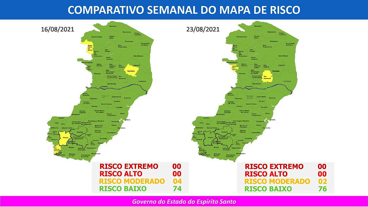 O Governo do Estado anunciou, nesta sexta-feira (20), o 69º Mapa de Risco Covid-19 que terá vigência de segunda-feira (23) até o próximo domingo (29). Dos 78 municípios capixabas, 76 estão classificados em Risco Baixo e apenas dois (Alto Rio Novo e Rio Bananal) em Risco Moderado.