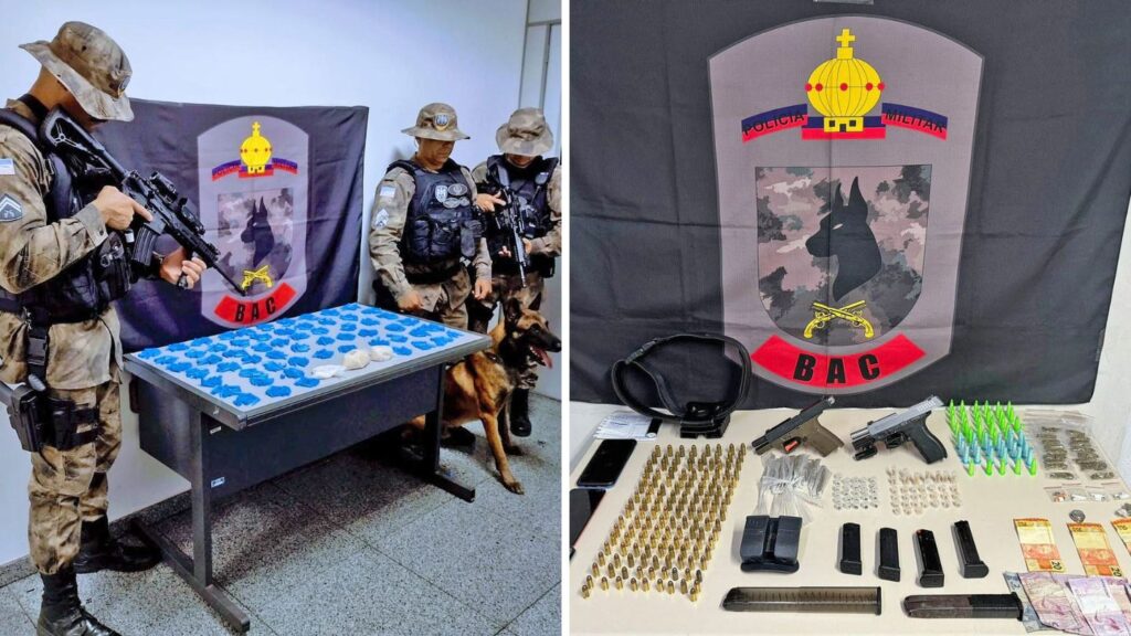 As equipes policiais foram desmembradas pela área, momento que encontraram na posse dos detidos uma pistola calibre .40 com mira laser, uma pistola calibre 9mm, oito carregadores (dois alongados e seis pequenos), um porta carregador, um cinto de guarnição, 53 pinos de cocaína, 18 buchas de maconha, 13 tiras de maconha, 31 pedras de crack, 26 porções de haxixe, quatro unidades de pac, 119 munições calibre 9mm, 17 munições calibre 380, 23 munições calibre .40 (14 percutidas) e a quantia de R$ 95,00 em espécie.