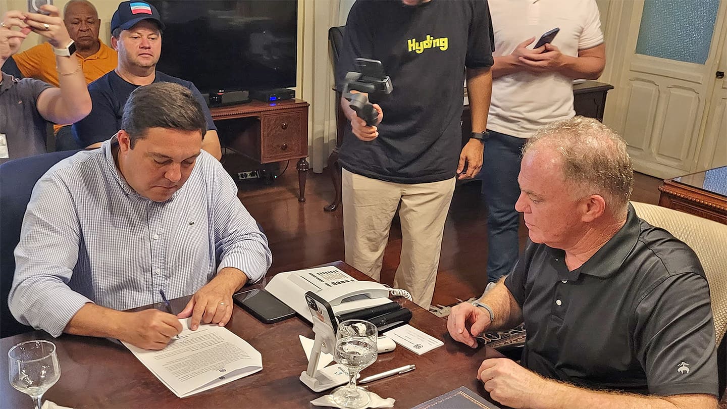 Secretário de Estado da Ciência, Tecnologia, Inovação e Educação Profissional, Bruno Lamas, e o governador do Estado Renato Casagrande, assinam o Termo de Fomento.