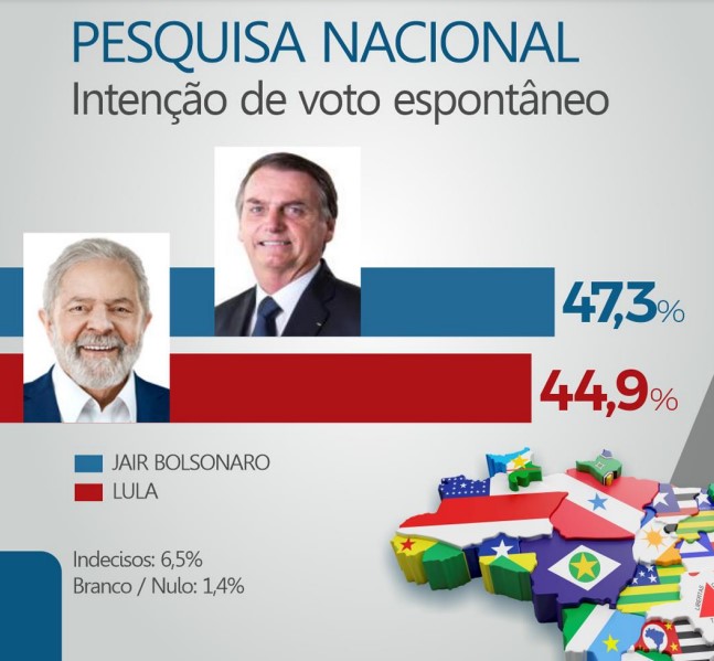 Na pesquisa de intenção de voto espontânea, Jair Bolsonaro aparece com 47,3% e Lula com 44,9%, ausentes 6,5%, brancos e nulos, 1,4%. Se considerar apenas os votos válidos, Jair Bolsonaro soma 51,3% e Lula, 48,7%.