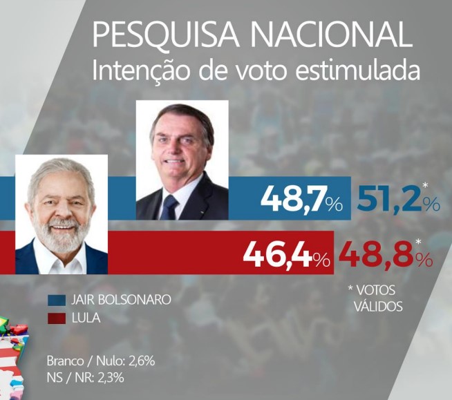 Já na intenção de voto estimulada, Jair Bolsonaro tem 48,7%, enquanto Lula, 46,4%. Brancos e nulos somam 2,6% e não sabem ou não responderam, 2,3%. Se considerar apenas os votos válidos, Bolsonaro tem 51,2% e Lula 48,8%.