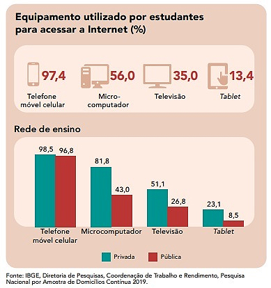 Em 2019, enquanto 81,8% dos estudantes da rede privada acessaram a Internet pelo computador, este percentual era de apenas 43% entre os estudantes da rede pública. O uso da televisão para acessar a Internet foi de 51,1% dos estudantes da escola privada, sendo este percentual o dobro do apresentado entre estudantes da escola pública (26,8%). No uso do tablet, a diferença chega a quase três vezes. Mais uma vez, o telefone móvel celular foi o principal equipamento utilizado para acessar a Internet pelos estudantes tanto da rede pública (96,8%) quanto da rede privada (98,5%).
