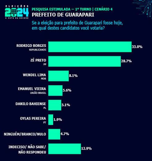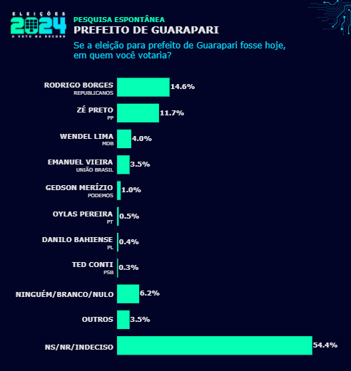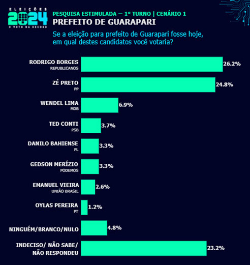 Os 400 eleitores com 16 anos ou mais foram ouvidos entre 26 de junho e 2 de julho de 2024. Na espontânea, onde os eleitores citam em quem votariam se a eleição fosse hoje, Rodrigo aparece com 14,6% e Zé Preto 11,7% da intenção de votos.