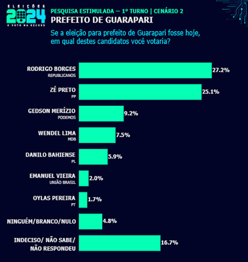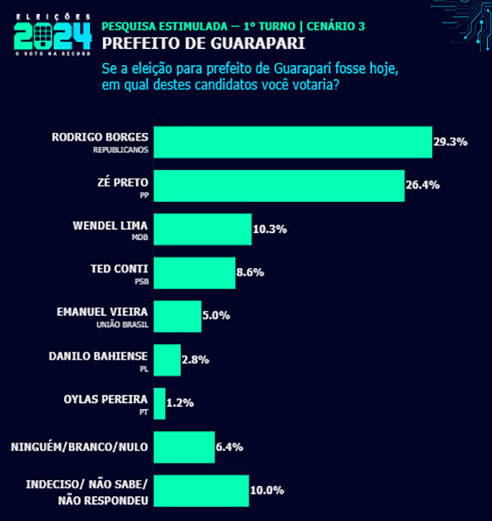 Segundo os dados, o vereador Rodrigo Borges, do Republicanos, e o deputado estadual Zé Preto (PP), estão empatados na margem de erro.