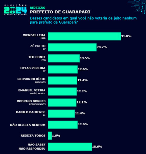 Wendel Lima lidera a rejeição com 31,0% quando apresentada uma lista com oito possíveis candidatos, seguido de Zé Preto 20,7%.