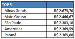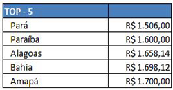 Do outro lado da lista, com as cinco médias salariais mais baixas, figuram Estados como Pará (R$1.506,00), Paraíba (R$1.600,00), Alagoas (R$1.658,14), Bahia (R$1.698,12) e Amapá (R$1.700,00).