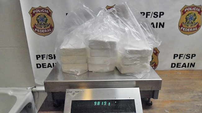 Policiais federais, que fiscalizavam as bagagens despachadas por passageiros de voo com destino a Portugal, desconfiaram do conteúdo de uma mala, após submetê-la ao raio-x. Em diligência junto ao portão de embarque, localizaram o proprietário da mala, um brasileiro, de 23 anos, que pretendia viajar para a cidade do Porto. O suspeito foi conduzido à sede policial para acompanhar a realização de perícia em sua bagagem. Dentro da mala foram encontradas duas mochilas contendo tabletes de cocaína, cujo volume somou 10 kg. O homem foi preso em flagrante.