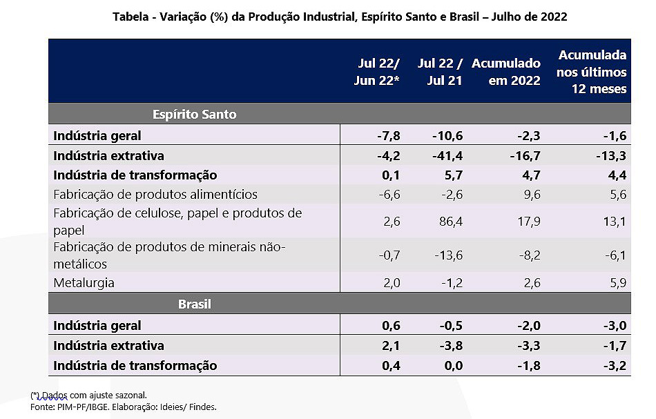 De janeiro a julho, a indústria geral, que soma indústria da transformação e indústria extrativa, recuou 2,3% no Espírito Santo. Já no país, a média foi de -2%.