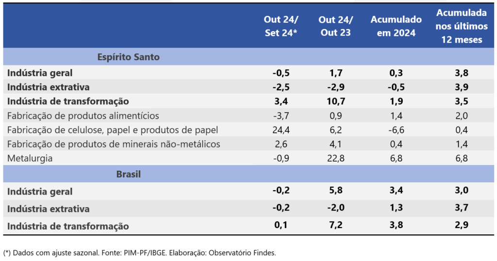 Por outro lado, a indústria extrativa capixaba registrou uma queda de 2,9% na comparação entre outubro de 2024 e outubro de 2023. De acordo com o gerente de Ambiente de Negócios do Observatório Findes, Nathan Diirr, esse recuo foi influenciado pela menor produção de petróleo e gás natural na comparação interanual.