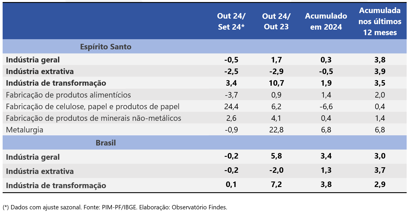 A PIM revelou ainda que o Espírito Santo teve um desempenho positivo em três das quatro bases de comparação: mensal comparada ao mesmo mês do ano anterior (1,7%), acumulada no ano (0,3%) e acumulada em 12 meses (3,8%). Somente a mensal comparada ao mês anterior registrou ligeira queda (-0,5%).