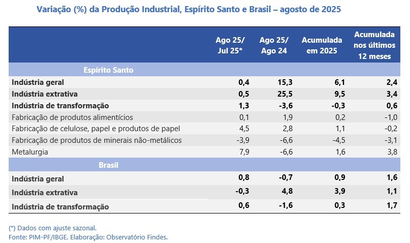 O desempenho industrial capixaba foi impulsionado pela expansão de 25,5% na indústria extrativa, em agosto deste ano na comparação com o mesmo mês de 2024, resultado do crescimento nas produções de minério de ferro pelotizado, petróleo e gás natural.