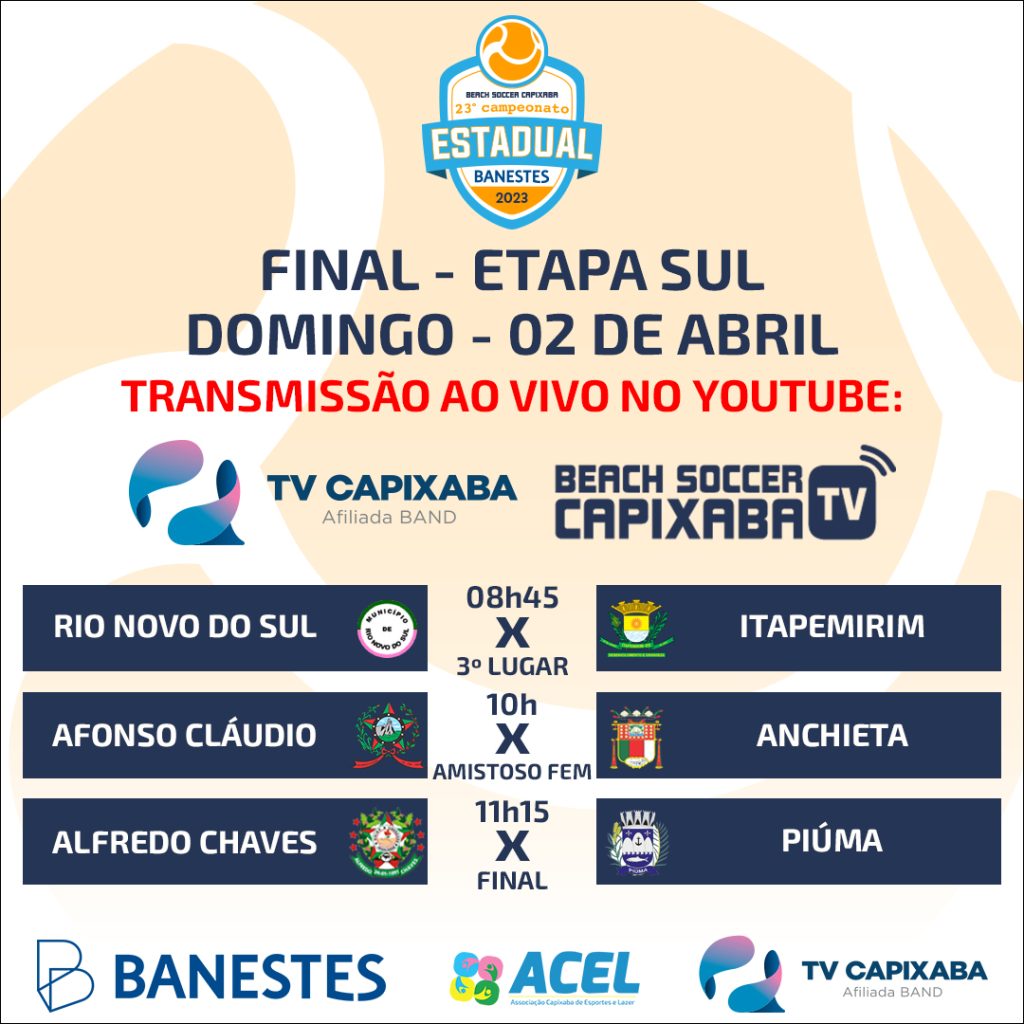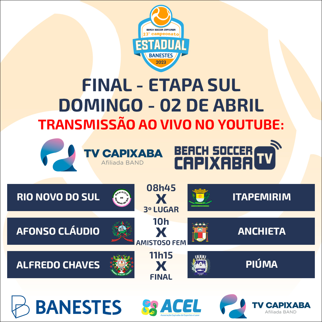 Alfredo Chaves e Piúma se classificaram para a decisão da Etapa Sul do 23º Campeonato Estadual Banestes de Seleções de Beach Soccer. A partida ocorre neste domingo (02), em Rio Novo do Sul, com transmissão ao vivo da FECABES TV e da TV Capixaba, ambos no YouTube.