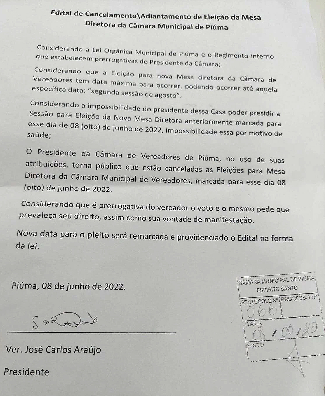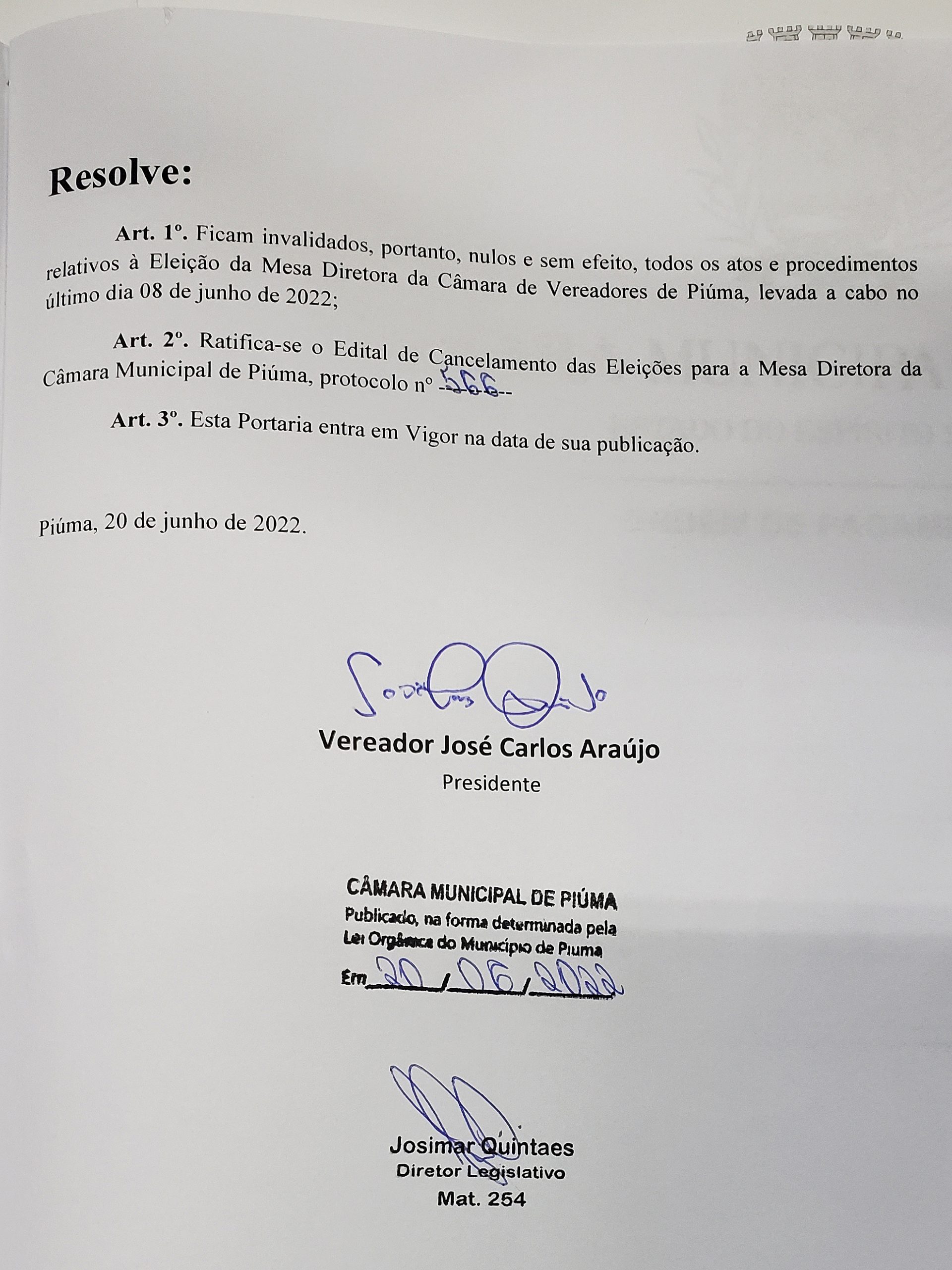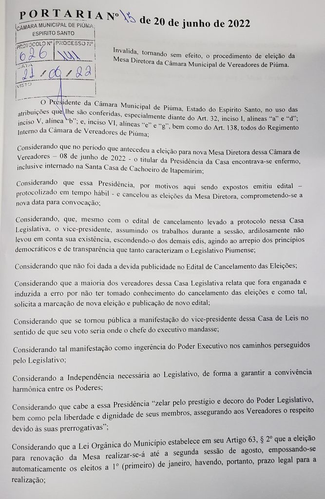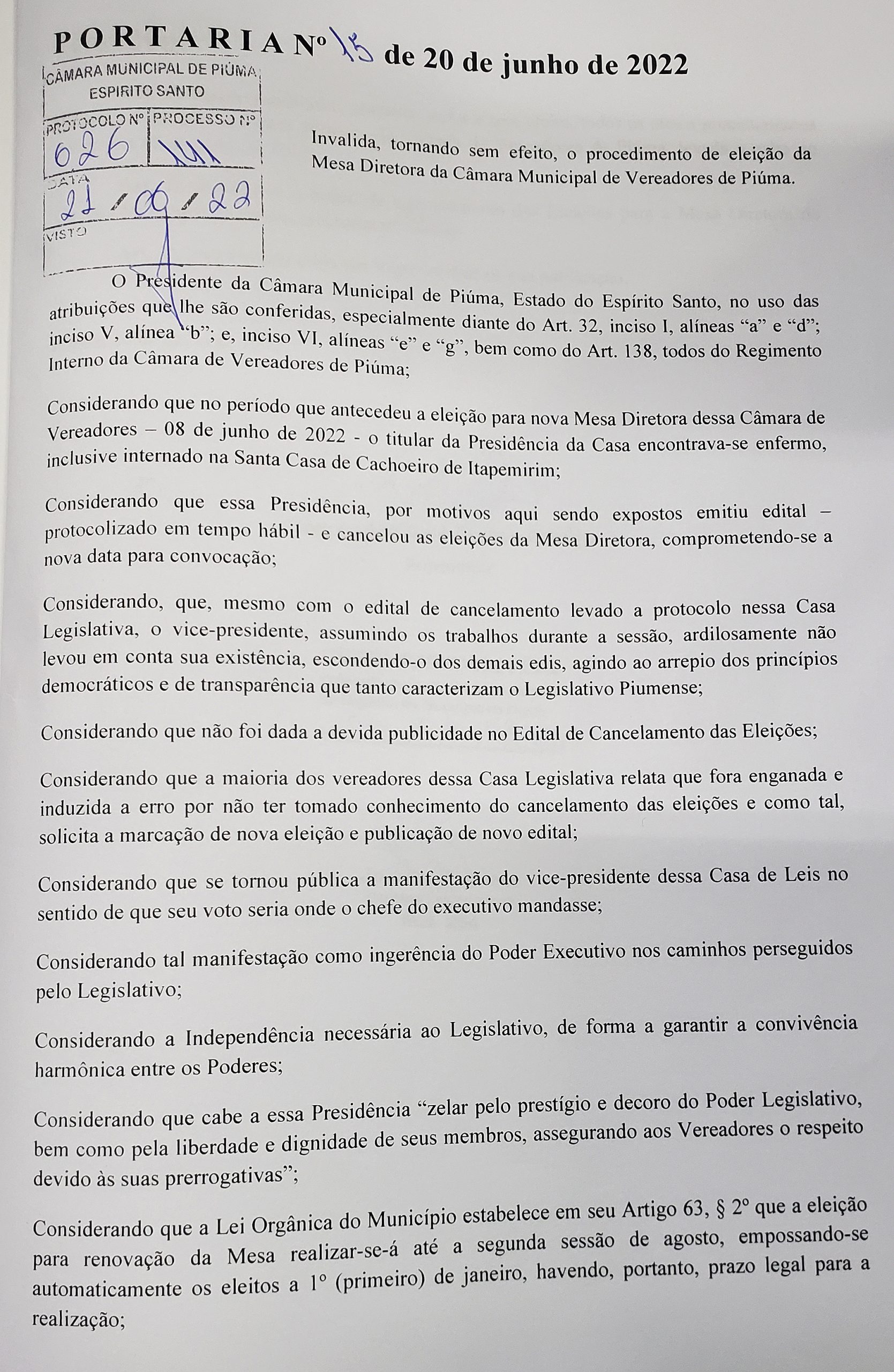 De acordo com a Portaria 15, de 20 de junho, a eleição se torna inválida, sem efeito e ainda, “considerando que no período que antecedeu a eleição para nova Mesa Diretora dessa Câmara de Vereadores – 08 de junho de 2022 – o titular da Presidência da Casa encontrava-se enfermo, inclusive internado na Santa Casa de Cachoeiro de Itapemirim”.