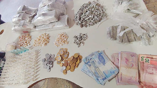 Com ajuda dos cães Eudes e Jhoy foi possível localizar uma sacola escondida em uma escadaria, contendo diversas buchas de maconha, haxixe e pinos de cocaína. Também, entorpecentes prontos para a comercialização e R$ 180, em dinheiro, foram localizadas em uma obra. Já na mata, foram encontrados os sete tabletes de maconha, pesando aproximadamente 7kg, espalhados em diversos pontos da região.