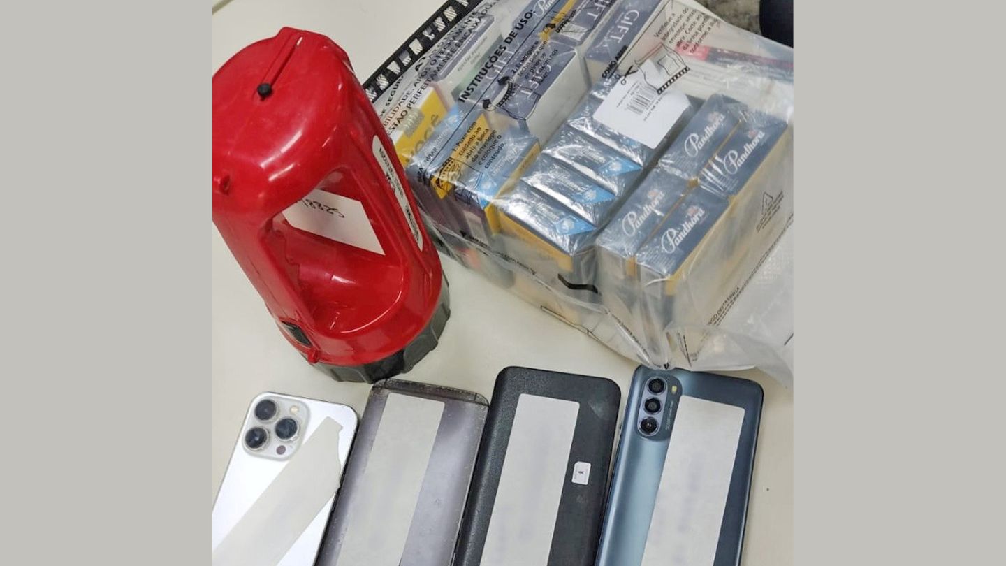 Durante a ação foi apreendido 20 maços de cigarro, três celulares, uma lanterna e um chip telefônico.