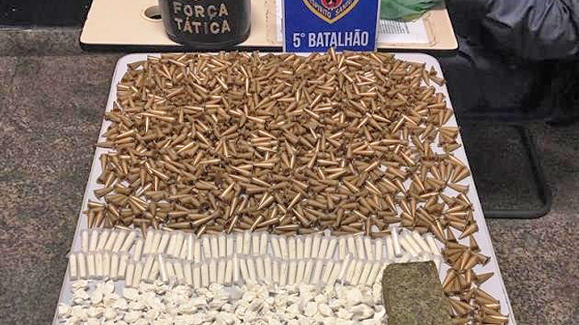 Em seguida foi realizado acompanhamento, com êxito na localização de D.A.F.S., 23 anos, e do menor D.J.P., 17. Em poder de D.J.P. foi encontrada a quantia de R$ 1.700 em espécie. No interior do veículo foram localizados 1.219 pinos de cocaína e 315 papelotes da mesma substância, além de dois tabletes de maconha pesando aproximadamente 975 gramas.