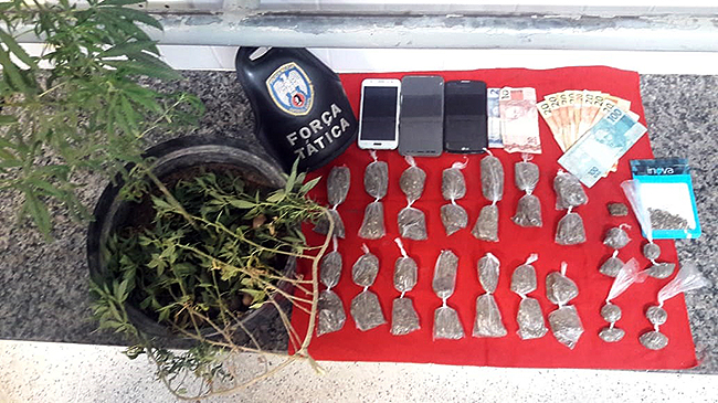 Ao perceberem que os abordados eram alvos de diversas denúncias de tráfico de drogas na região, foram realizadas diligências, sendo encontradas na residência de um dos abordados 35 buchas grandes de maconha, dois pés de maconha, sementes do mesmo entorpecente, quantia em dinheiro, três celulares e uma motocicleta.