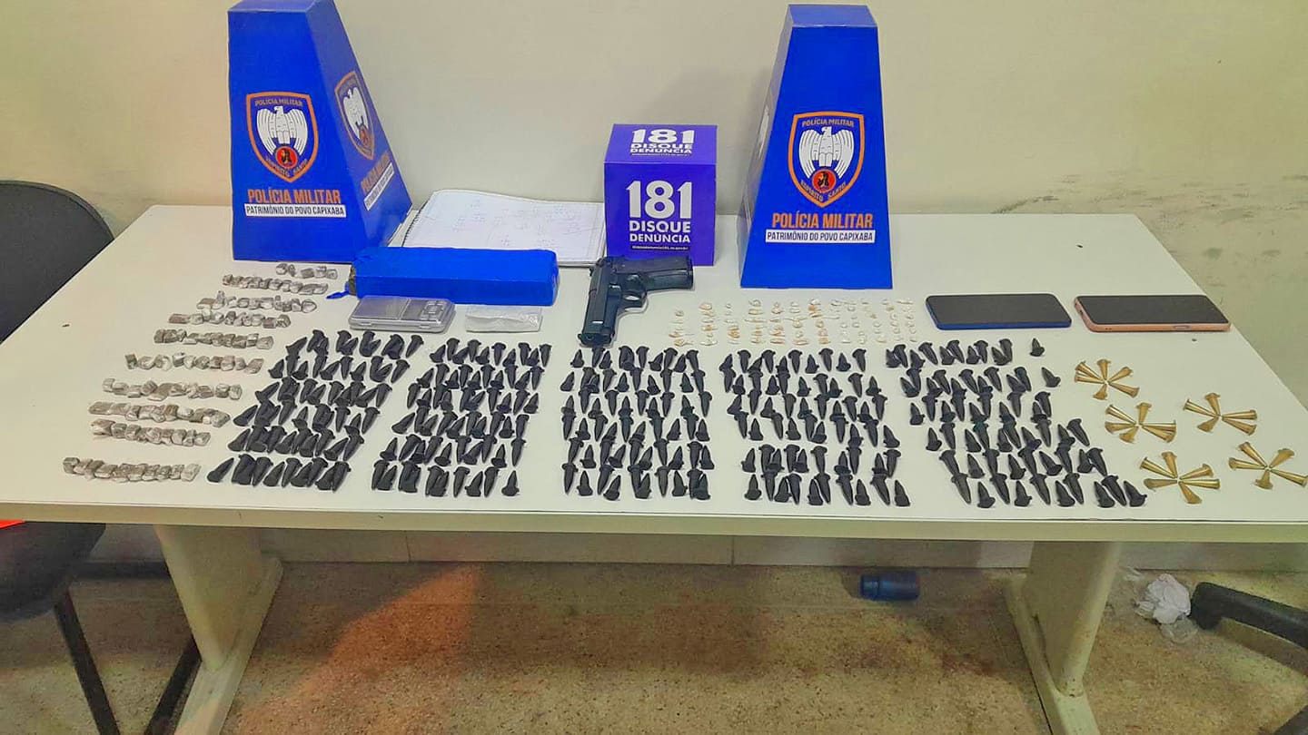 Na residência do segundo abordado apreenderam um tablete de maconha, 63 buchas de maconha, 151 pinos com cocaína, 50 pedras de crack, um simulacro de pistola e uma balança de precisão.