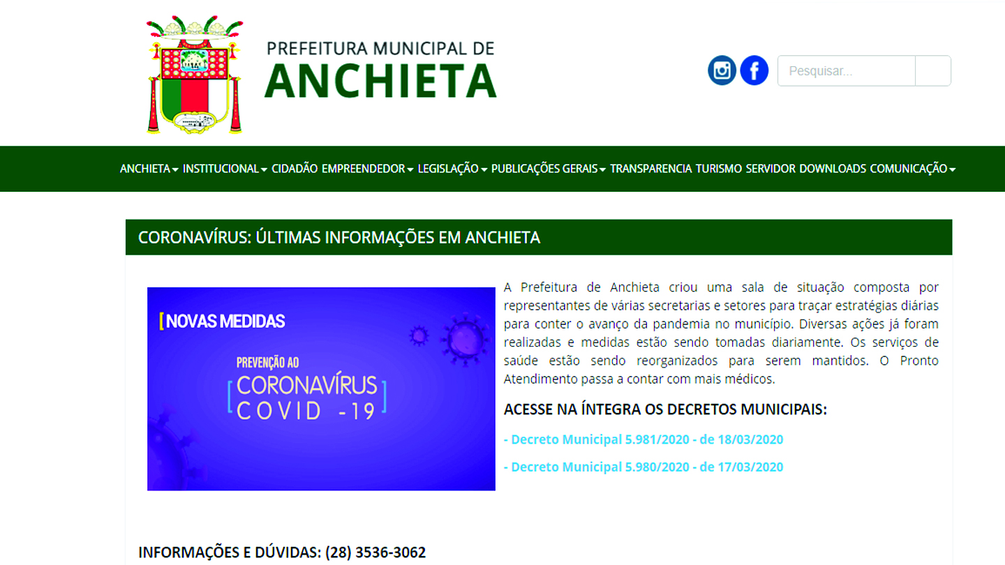 A Prefeitura de Anchieta criou uma página exclusiva em seu site para trazer as últimas informações e medidas adotadas para conter o avanço do coronavírus no município. Os internautas poderão acessar notícias atualizadas com boletins diários. Para acessar digite em seu navegador www.anchieta.es.gov.br e clique em um banner no lado direto abaixo das notícias em destaque.