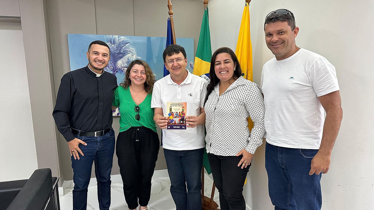 Na reunião, o Padre Ronaldo entregou ao Prefeito o texto base da campanha da fraternidade, que em 2024 tem como tema “Fraternidade e Amizade Social”.