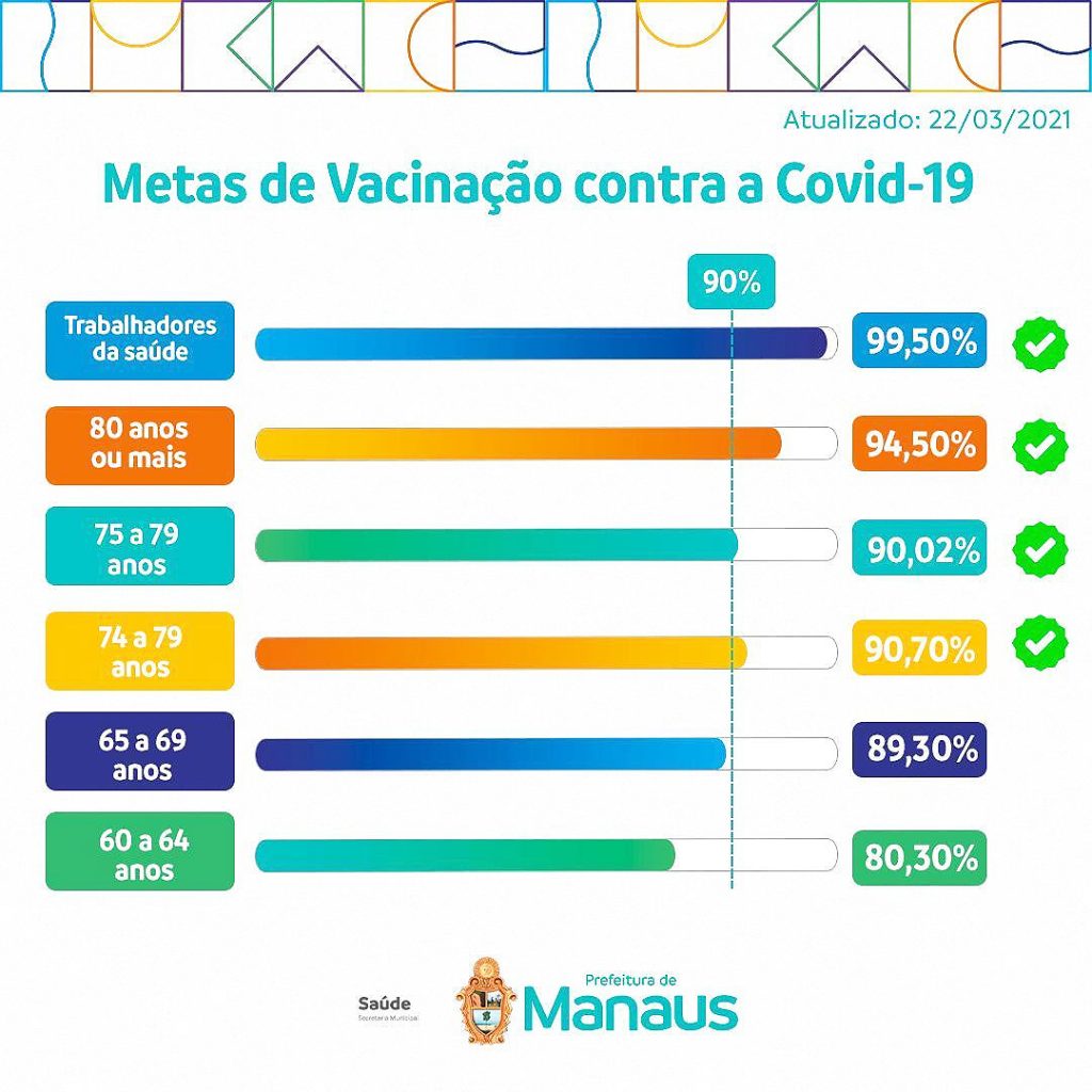 O “Vacinômetro” da Prefeitura de Manaus registrou, no último final de semana, a marca de mais de 10% da população vacinada contra a Covid-19. Dados da plataforma apontam que às 7h desta segunda-feira, 22/3, já haviam sido aplicadas 224.984 primeiras doses das vacinas CoronaVac/Butantan e AstraZeneca/Oxford. Esse número representa 10,1% da população estimada para Manaus em 2020, que, de acordo com o Instituto Brasileiro de Geografia e Estatística (IBGE), é de 2.219.580 habitantes. Além disso, para o grupo dos trabalhadores da saúde e dos idosos de 70 anos ou mais, o município superou a meta de vacinar 90% da população, conforme estipulado pelo Ministério da Saúde.