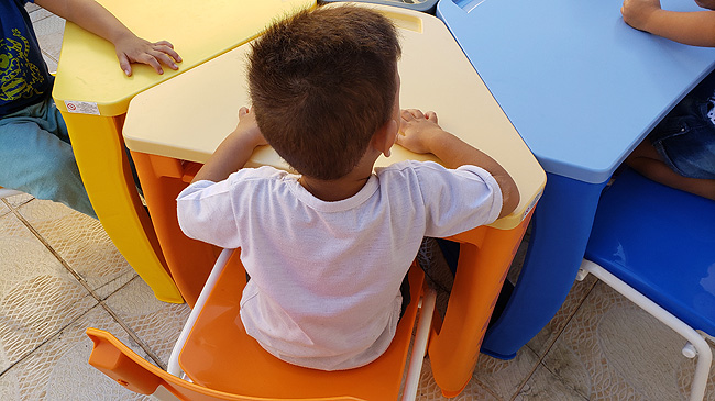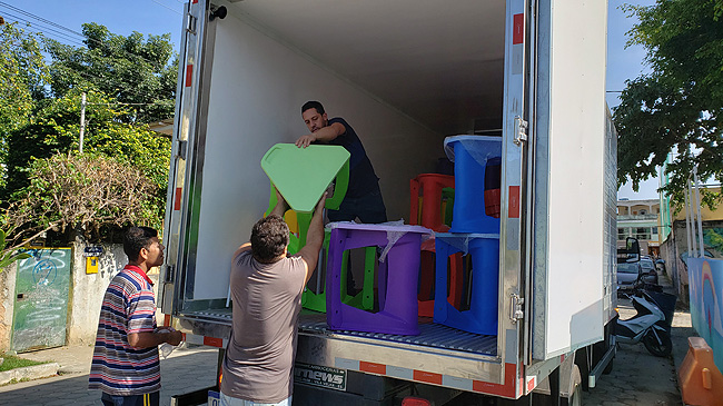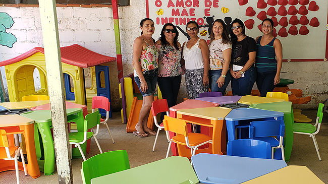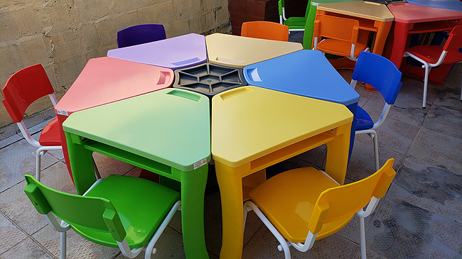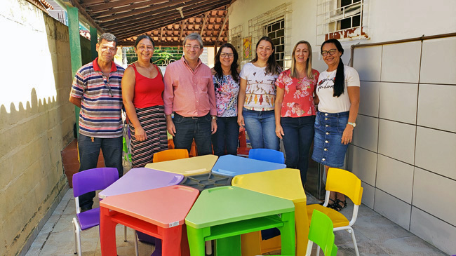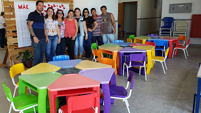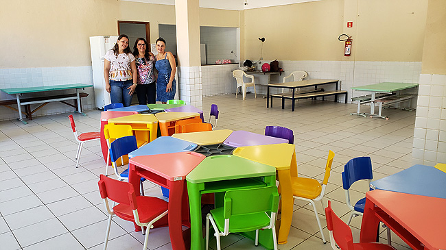 Estão sendo entregues 32 jogos modelo trapézio nas cores azul, vermelha, amarela, verde, branca, roxa e laranja, com centro aparador para material didático, que chamou a atenção das crianças, que comemoram a chegada do novo mobiliário.