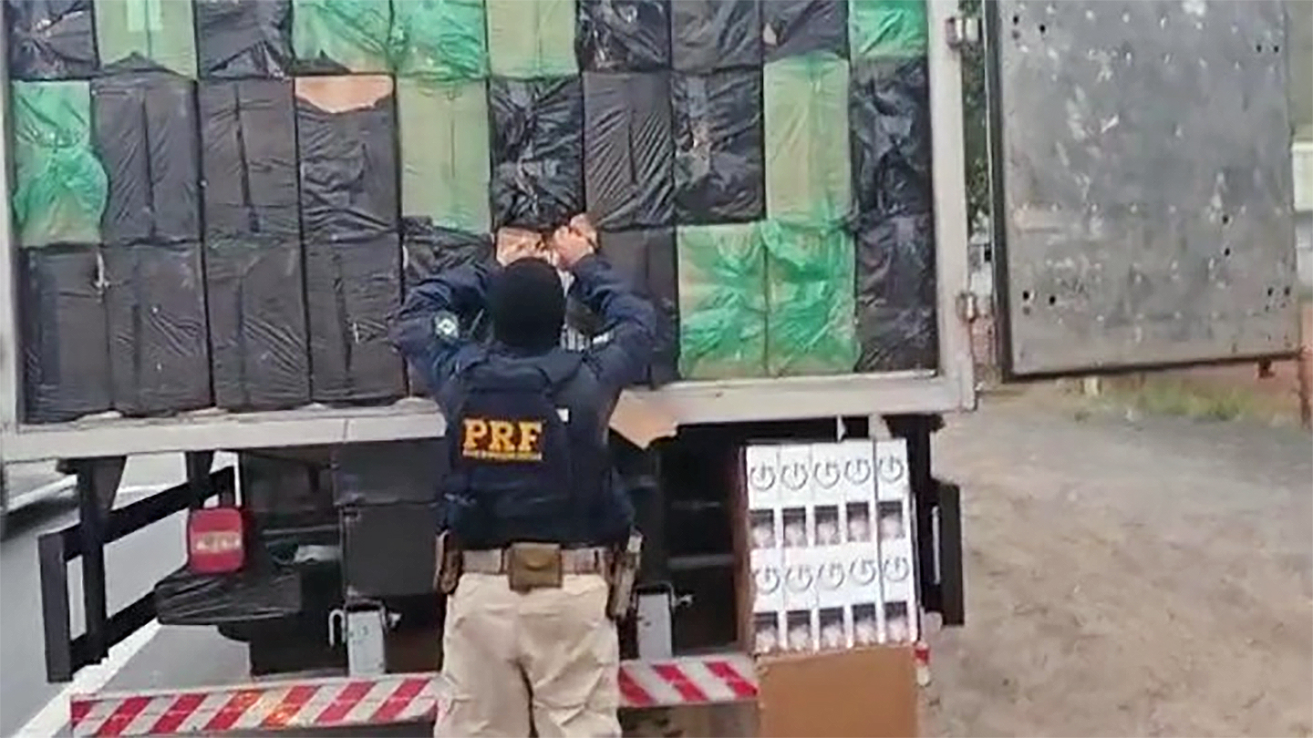 Ao abrir o compartimento de cargas, os policiais encontraram 900 caixas de cigarros contrabandeados, que totalizaram 450 mil maços. O valor estimado da carga é de R$ 2.250.000.