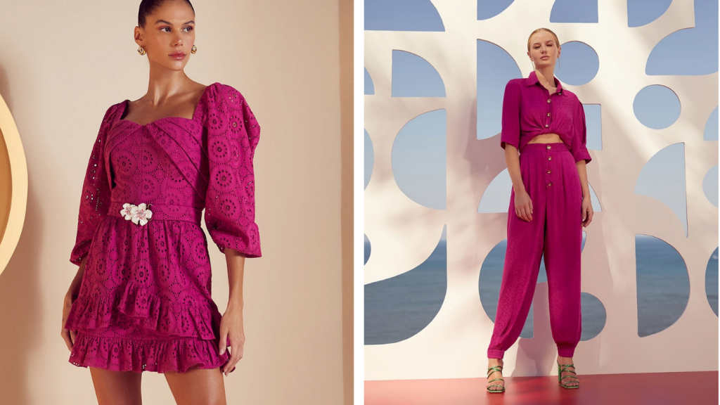 Apesar do verde ser o favorito da vez, existem outras opções que também vão aparecer muito, inclusive fazendo misturas entre si. Uma dessas é a orquídea, que carrega a tonalidade quente do rosa, alegrando as peças, mas que mantém a elegância do fundo arroxeado.