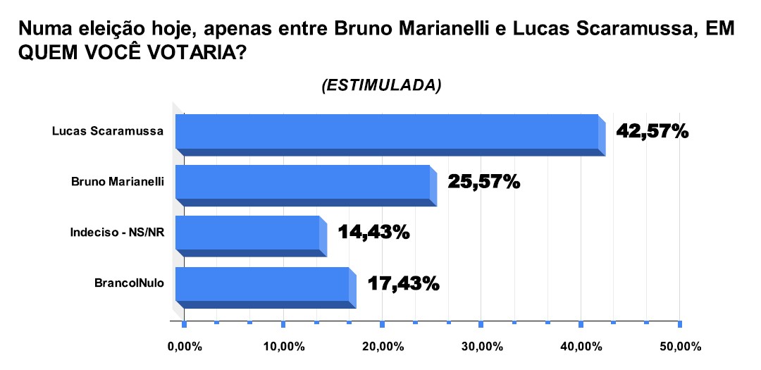O Instituto de Pesquisas Perfil também apresentou um cenário estimulado com a participação dos quatro principais candidatos, em que o deputado estadual Lucas Scaramussa alcança 29,23%, com Marianelli em segundo (22,21%), Elias em terceiro (17,05%) e Rossoni na quarta posição, com 4,44%.