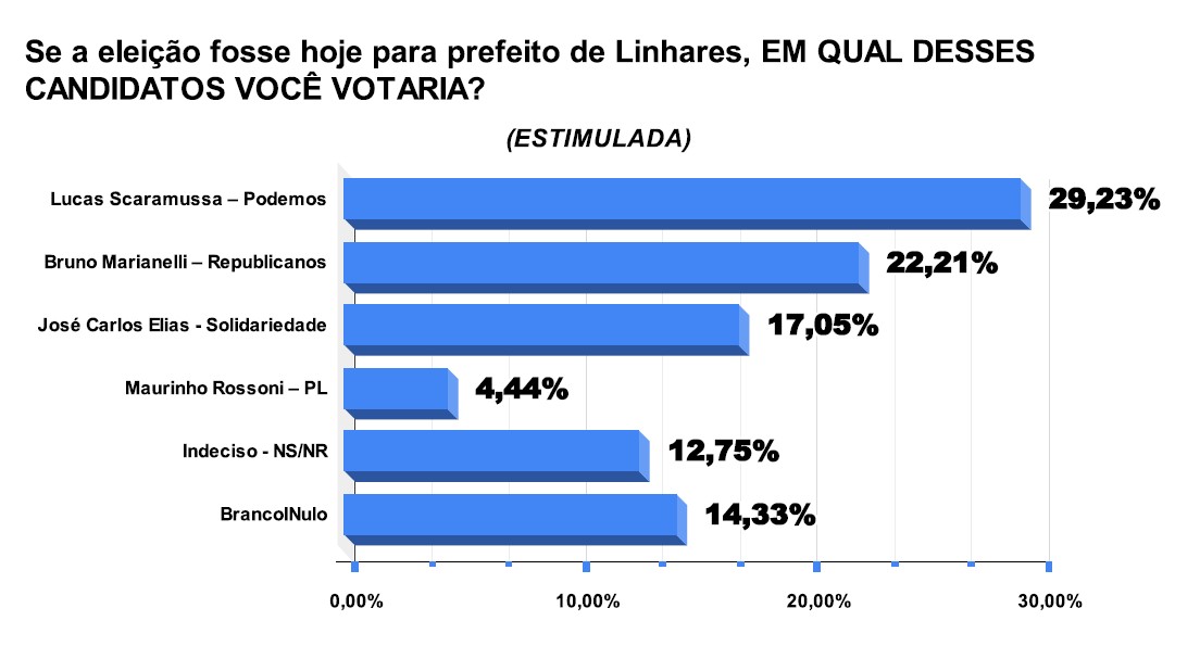 A primeira pesquisa eleitoral registrada para a disputa à prefeitura de Linhares, divulgada nesta quarta-feira (24), traz o deputado estadual Lucas Scaramussa (Podemos) na liderança, com 42,57% das intenções de votos em um confronto direto contra o atual prefeito Bruno Marianelli (Republicanos), com 25,57%.