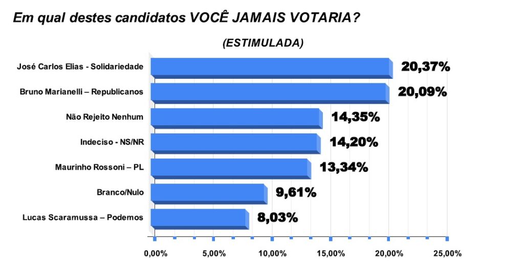 Ainda de acordo com o levantamento, 20,09% dos entrevistados afirmaram que “jamais votariam” em Bruno Marianelli, ante 8,03% para Lucas Scaramussa, 13,34% para Maurinho Rossoni e 20,37% para José Carlos Elias.