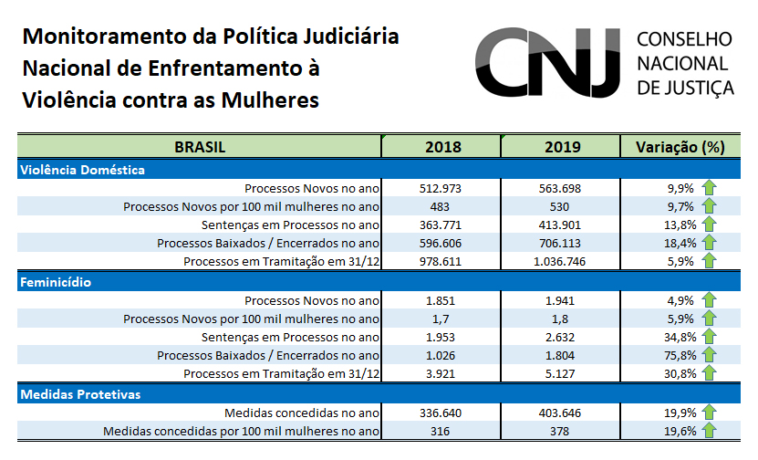 Também foi verificado aumento no número de sentenças em processos: foram 35% de sentenças a mais nos casos de feminicídio e 14% a mais nos de violência doméstica.