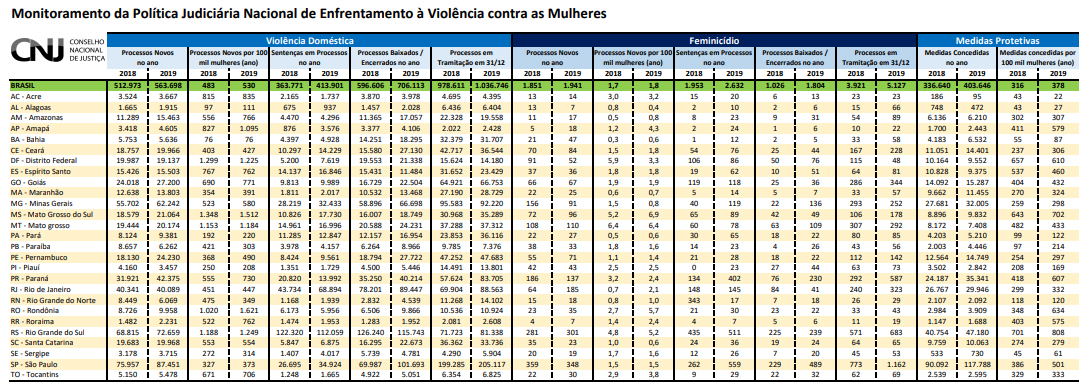 O Brasil terminou o ano de 2019 com mais de um milhão de processos de violência doméstica e 5,1 mil processos de feminicídio em tramitação na Justiça. Nos casos de violência doméstica, houve aumento de quase 10%, com o recebimento de 563,7 mil novos processos. Os casos de feminicídio que chegaram ao Judiciário cresceram 5% em relação a 2018. Os dados estão no Painel de Monitoramento da Política Judiciária Nacional de Enfrentamento à Violência Contra as Mulheres, do Conselho Nacional de Justiça (CNJ), divulgados nesta segunda-feira (9).