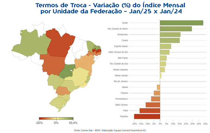 Os termos de troca capixabas apresentaram o quinto melhor resultado entre os estados brasileiros na comparação entre janeiro de 2025 e janeiro de 2024. A alta de 4,3% no preço das exportações foi a segunda melhor do país, ficando atrás somente do Amazonas.
