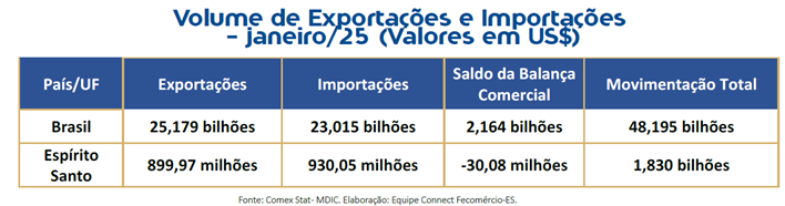 Em janeiro, o Espírito Santo apresentou uma movimentação total do comércio exterior de cerca de 1,83 bilhão de dólares, o que representou um leve recuo de 2,5% na movimentação em relação a dezembro de 2024. Houve um volume de cerca de 900 milhões de dólares em exportações e 930 milhões de dólares em importações.