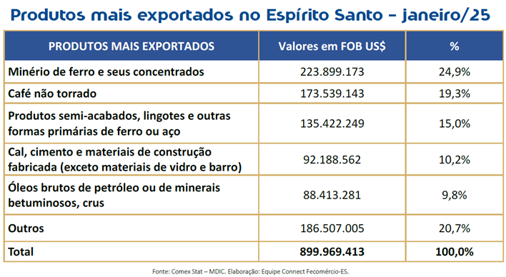 O principal destaque das exportações capixabas em janeiro foi o minério de ferro e seus concentrados, que liderou o ranking com 223,9 milhões de dólares, representando 24,79% do total exportado no mês.