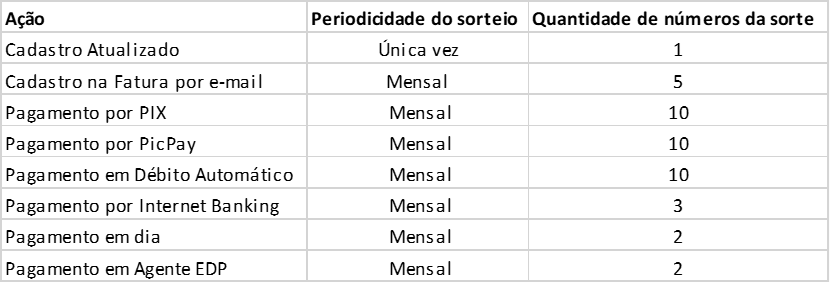 Após a inscrição no site da promoção, cada participante (válido somente um cadastro por unidade consumidora) receberá números da sorte gerados automaticamente por instalação cadastrada, conforme as ações abaixo listadas, podendo ser acumulativas entre elas, desde que realizadas dentro do mesmo período de participação: