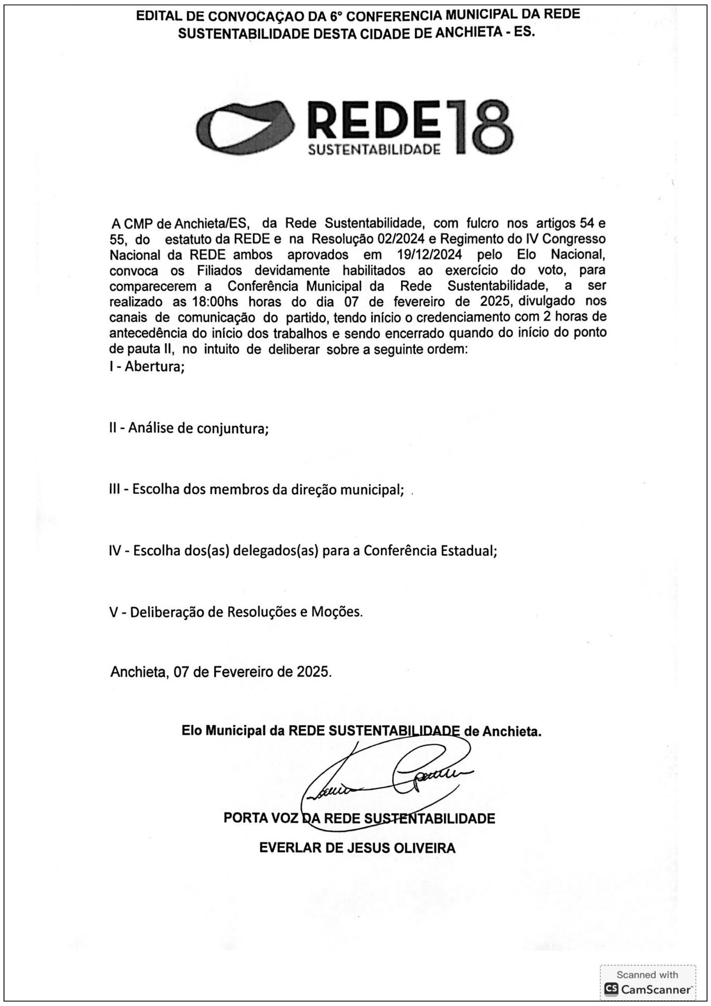 EDITAL DE CONVOCAÇÃO – REDE SUSTENTABILIDADE DE ANCHIETA