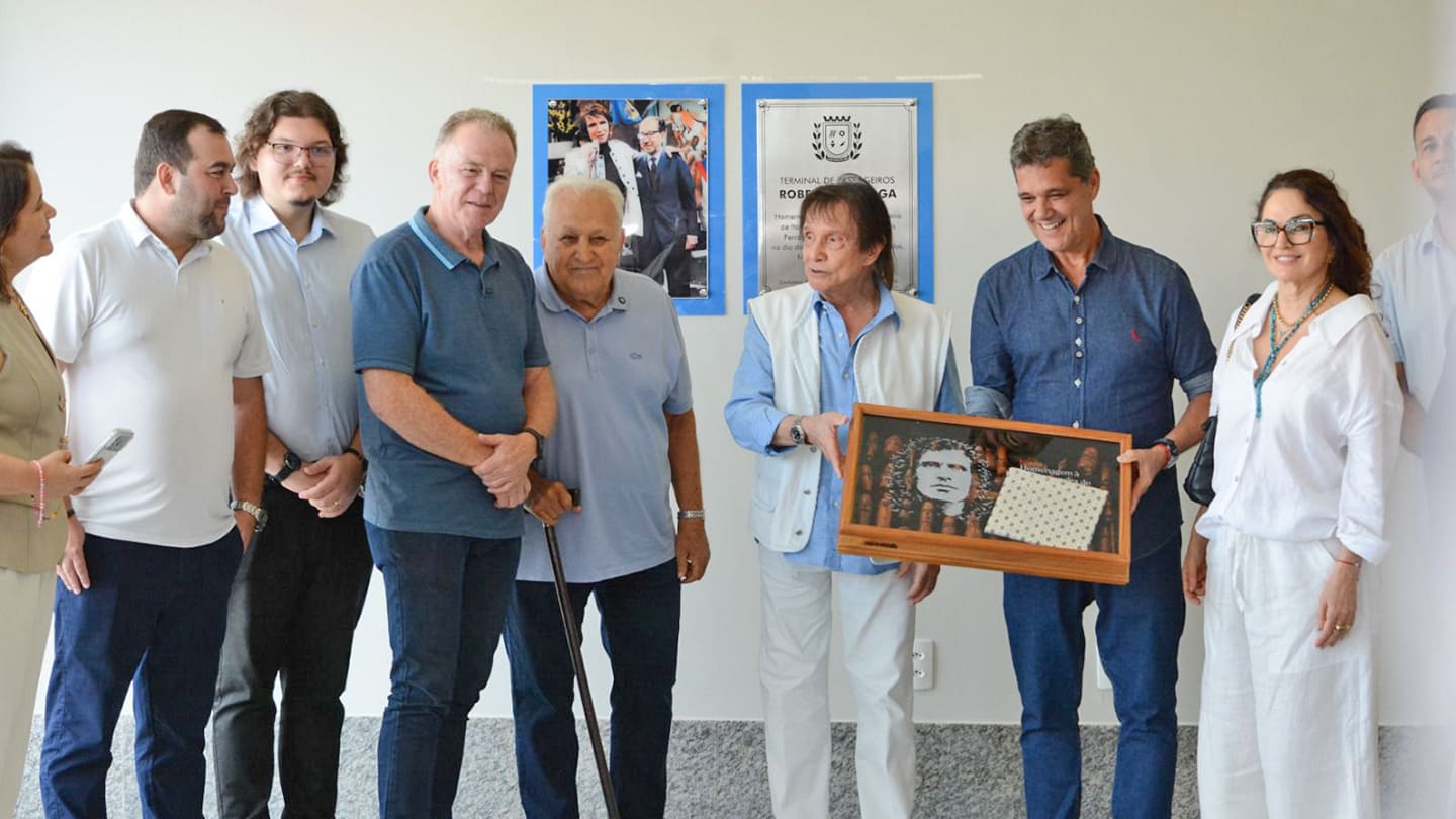 Logo após desembarcar no aeroporto do município, o artista participou de uma cerimônia especial em homenagem ao pai, Robertino Braga, que agora dá nome ao terminal de passageiros do aeroporto recém-reformado. O evento foi conduzido pelo prefeito Theodorico Ferraço, que também inaugurou uma placa comemorativa e instalou uma imagem do cantor ao lado do pai — gesto que visivelmente emocionou Roberto Carlos.