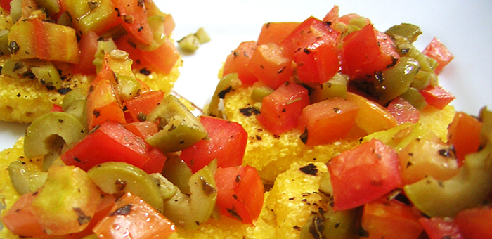 Entrada: Bruschetta de polenta e saladinha de folhas frescas
