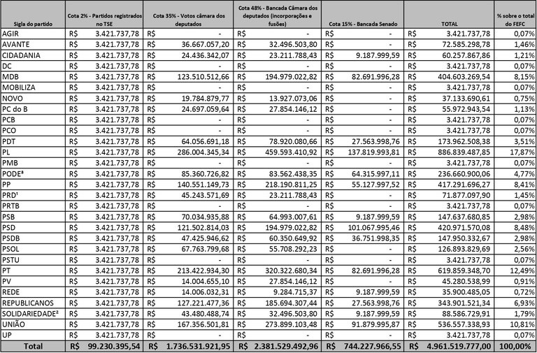 O Tribunal Superior Eleitoral (TSE) divulgou, na segunda-feira (17), os valores que cada partido vai receber do Fundo Especial de Financiamento de Campanha (FEFC), seguindo o prazo fixado pelo calendário eleitoral. Ao todo, 29 partidos receberão R$ 4.961.519.777,00, valor estabelecido pelo Congresso Nacional para gastos com a corrida eleitoral deste ano. Os critérios da divisão também foram fixados em lei pelo parlamento (Lei nº 9.504/1997, artigo 16-D).