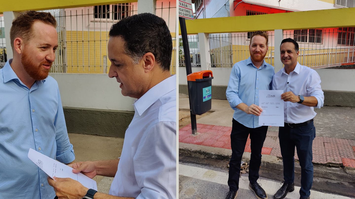 De Angelo, o subsecretário de Suporte da pasta, Vinícius Simões, o diretor Diassis Ximenes e o deputado estadual Fabrício Gandini (PSD) estiveram na Escola Renato Pacheco, em Jardim Camburi. A unidade foi climatizada, obra que beneficiou 1.200 alunos. Gandini é o autor da Lei Estadual 11.605, que garante temperaturas adequadas (entre 20ºC e 23ºC) nas salas de aula das escolas públicas.
