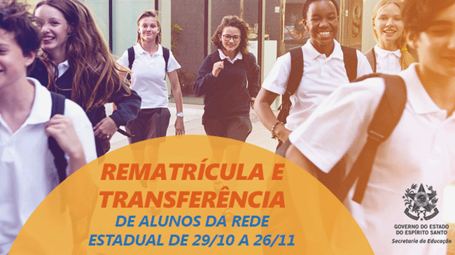 * O período de rematrícula e/ou solicitação de transferência interna, ou seja, para os alunos que já são da Rede Estadual, será de 29/10 a 26/11;