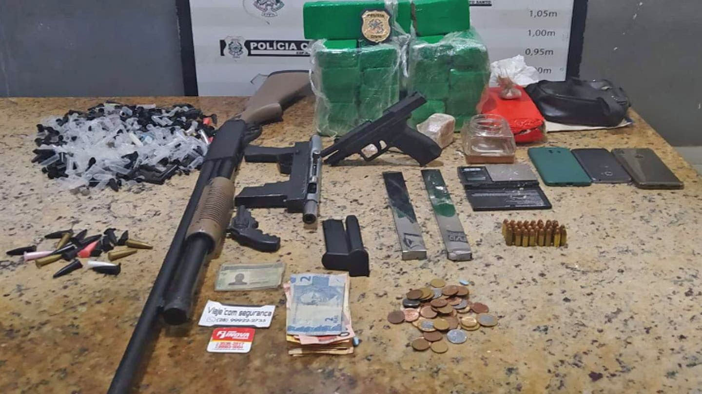 Os militares também encontraram no local armas como, submetralhadora, pistola e drogas.