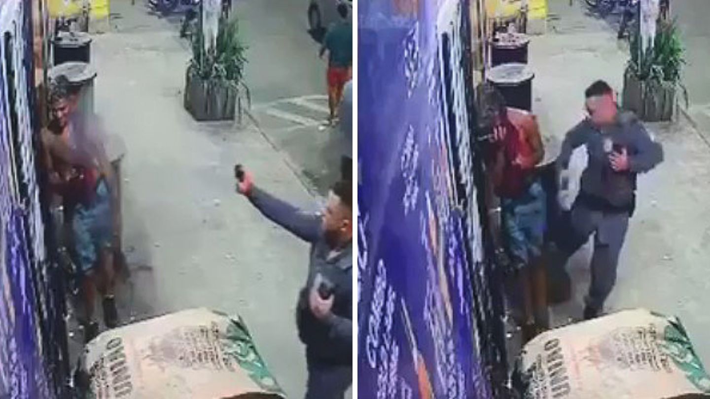 As imagens gravadas por uma câmera do estabelecimento comercial, mostram a vítima não apresentando nenhuma resistência e mesmo assim é atingido por jatos de spray de pimenta nos olhos, e ainda leva chute e tapa do policial.