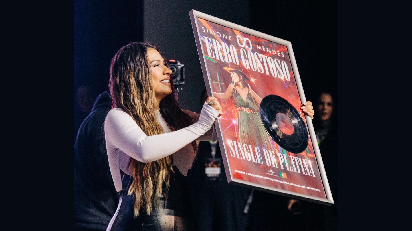 Não é só no Brasil que Simone Mendes faz muito sucesso com shows esgotados e músicas no topo das plataformas digitais. A artista conquistou o disco de platina em Portugal e, “Erro Gostoso”, alcançou a marca de mais de 10 mil unidades vendidas, mais de 16 milhões de streams no Spotify  e mais de 10 milhões de visualizações no YouTube do país.